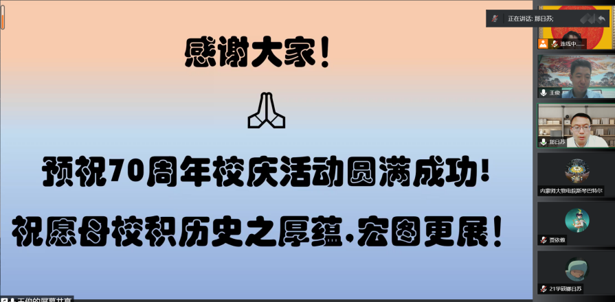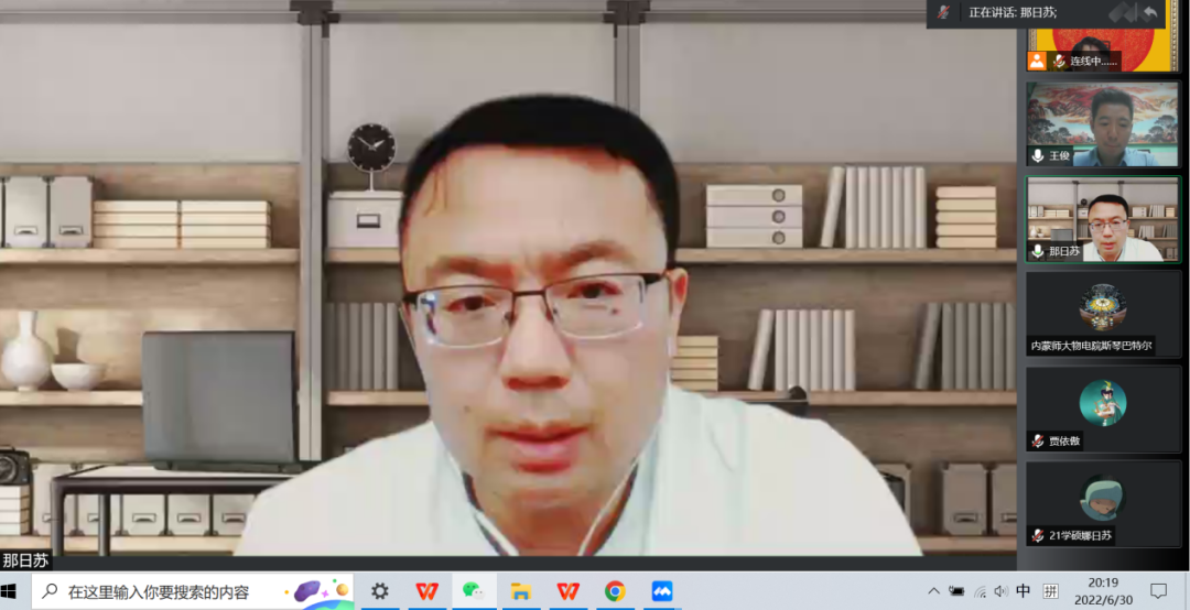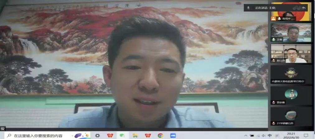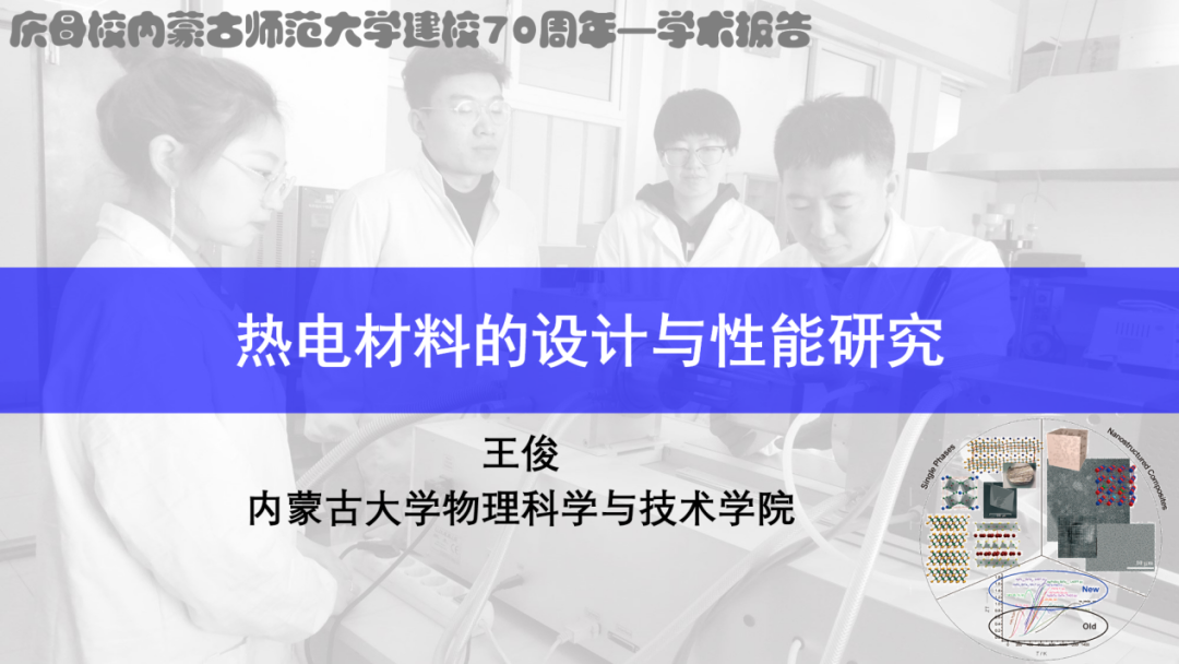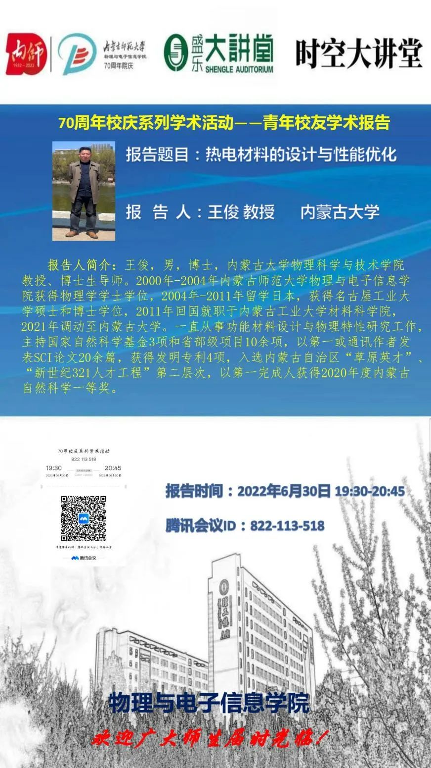 6月30日晚,我院喜迎70周年校庆系列学术活动举办第二场青年校友学术报告活动。本场学术报告特邀我院优秀校友,内蒙古大学物理科学与技术学院教授、博士生导师王俊教授做客时空大讲堂,为师生作了题为《热电材料的设计与性能研究》的学术报告。学术报告由我院副院长那日苏主持,学院各系多位教师和各年级学术型研究生聆听了报告。