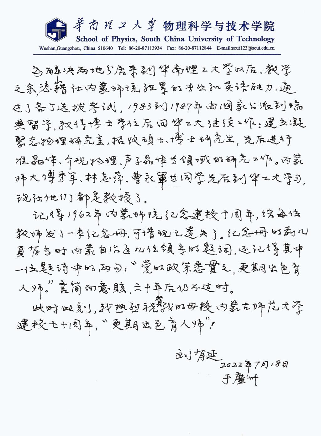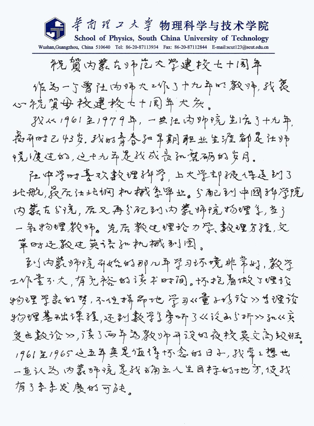 值此内蒙古师范大学建校七十周年校庆之际,刘有延老师特来信祝贺母校建校七十周年华诞。