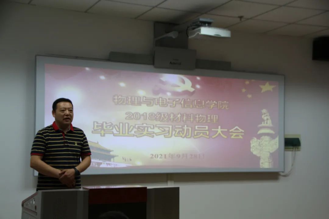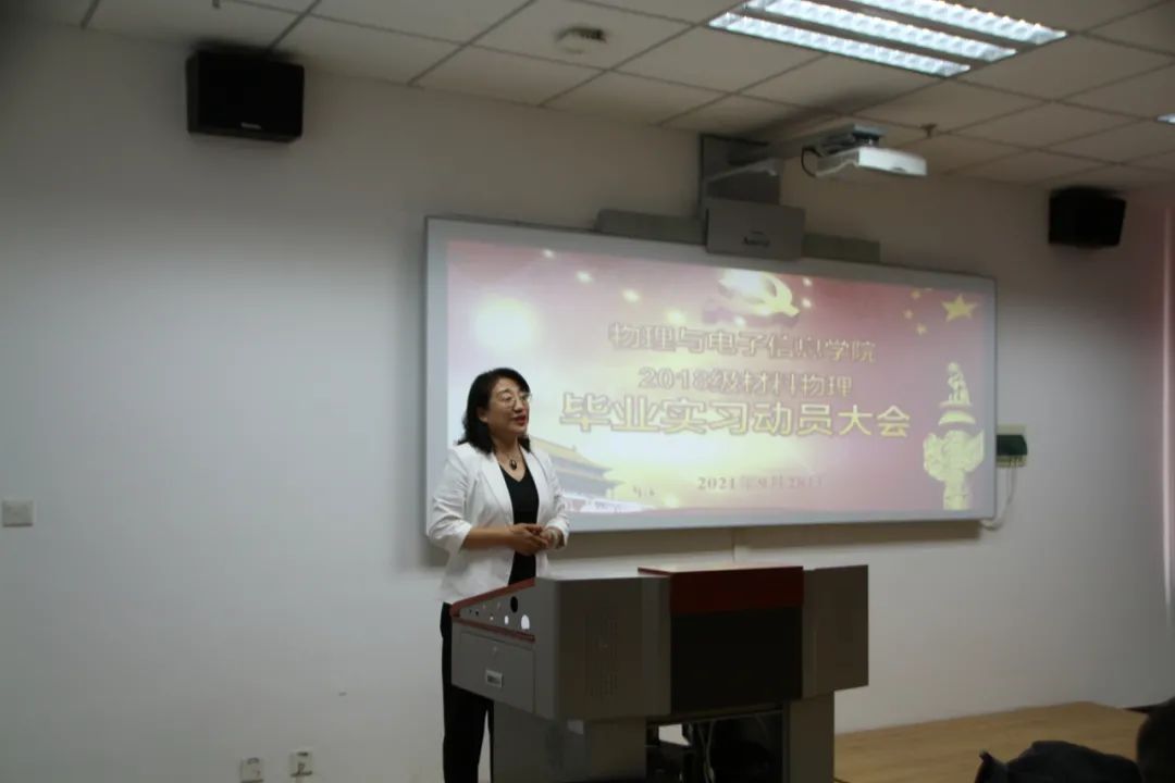 为进一步加强和规范材料物理专业实习,确保毕业年级的实习工作有序开展,9月28日下午,我院于理工楼A0301学术报告厅召开2018级材料物理专业毕业实习动员大会,党委书记刘美玲,院长曹永军,党委副书记兼副院长张伟,副院长那日苏出席本次会议,2018级材料物理专业全体学生参会。本次会议由材料系副主任包黎红主持。