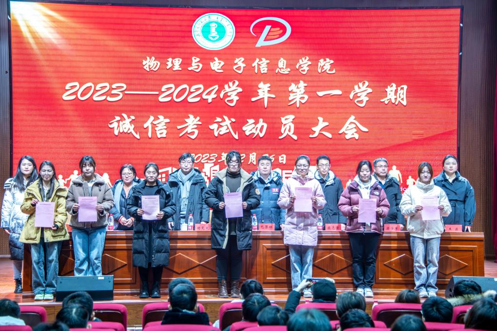 会上,2023级材料物理班学生史浩宇代表2023级全体本、硕学生宣读诚信考试承诺书。他表示,诚实守信,是中华民族传统美德,是我国公民基本道德规范之一。作为一名大学生,我们应该诚信做人,保证在考试中诚实守信,自觉遵守考试有关规定。2023级各班本、硕学生代表上台签署诚信考试承诺书。