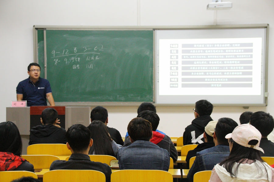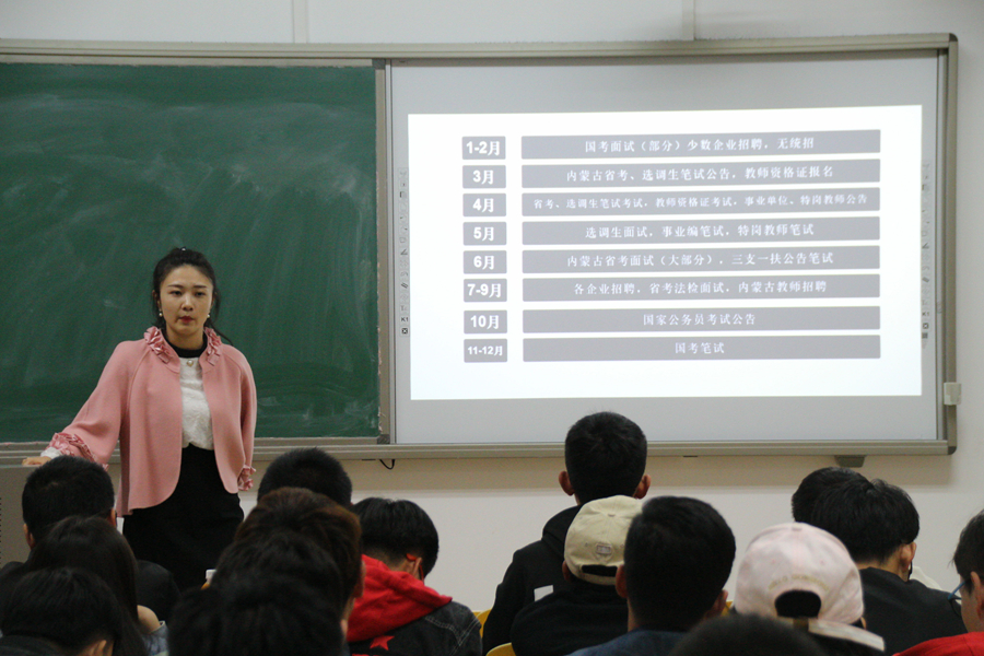 讲座开始前,我院辅导员宝力尔老师介绍了王萱、赵洋两位老师的简历,伴随着热烈欢迎的掌声,本次讲座拉开序幕。首先,王萱老师从公务员考试报名、职位选择、考试应变、面试技巧等方面为同学们进行了详细地讲解,王老师思路清晰,指导明确,方法实用,赢得同学们一致好评。随后,赵洋老师为同学们进行了考研指导专题讲座。赵老师开门见山,一针见血的点出了考研现状之严峻,从报考择校、学习方法、应试技巧等方面为同学们逐一讲解,使同学们加深了对考研的了解,掌握了考研复习、报名以及应试等技能,同学们纷纷表示受益匪浅。