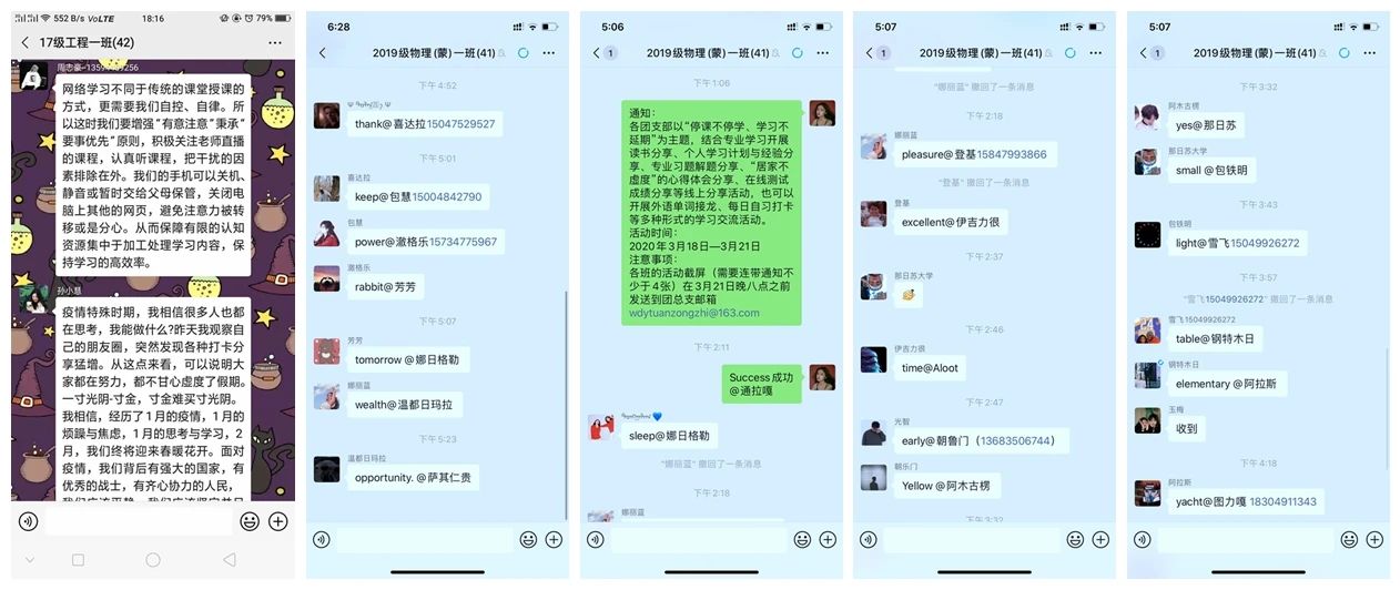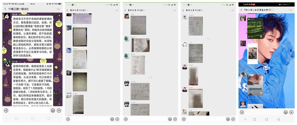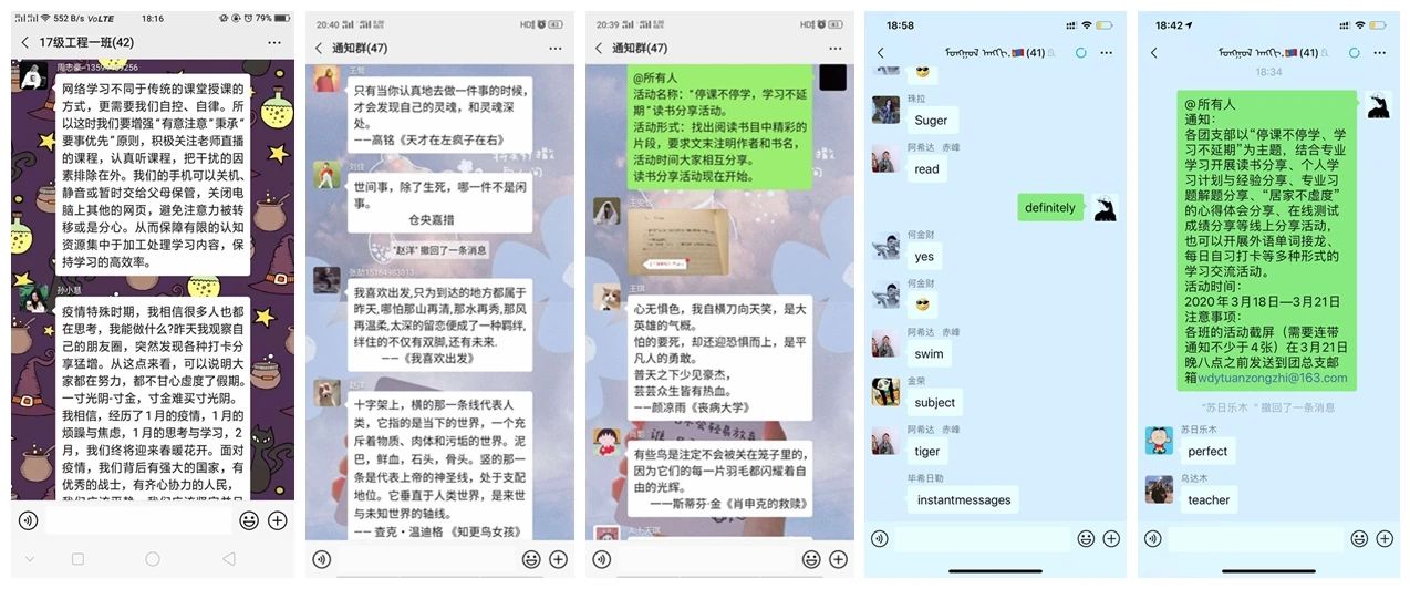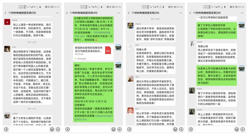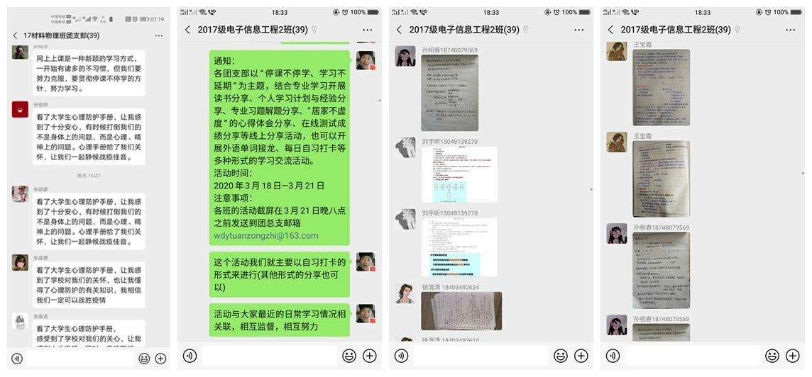 活动期间,同学们结合专业学习开展读书分享、个人学习计划与经验分享、专业习题解题分享、“居家不虚度”的心得体会分享、在线测试成绩分享等线上分享活动,与同学们交流假期内的经历计划,也有部分团支部开展外语单词接龙、每日自习打卡等多种形式的学习交流活动,积极督促同学们自主学习,自查自纠,营造良好的专业学习氛围。