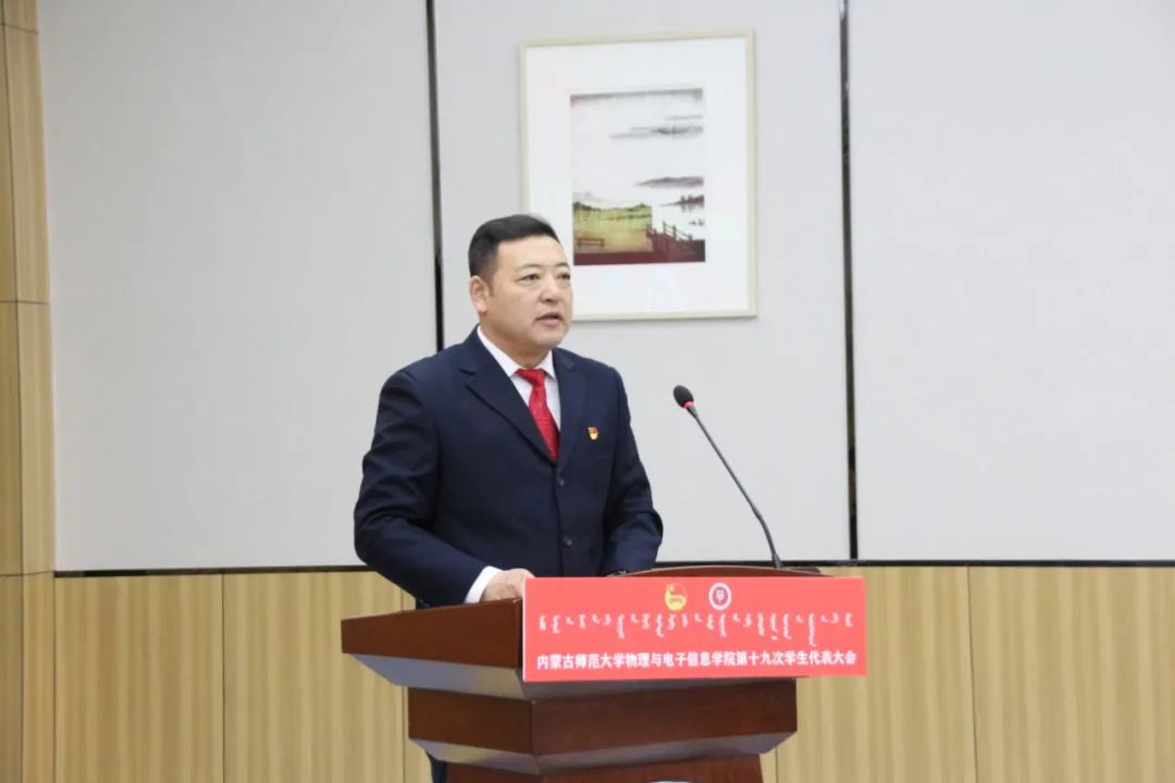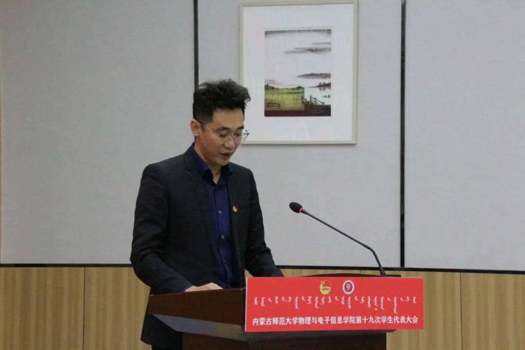 校团委青年发展部副部长孟伟东老师代表校团委首先对我院团学工作给予了充分肯定,其次从坚定理想信念、培育高尚品格,、练就过硬本领三个方面向我院广大青年学生提出了建议和希望。他希望,青年学生代表在团组织的带领下,以此次学代会为契机,紧跟中国共产党的脚步,不忘跟党初心,坚守青春使命,在新中国前进的道路上展现内蒙古师范大学物理与电子信息学院的风采。