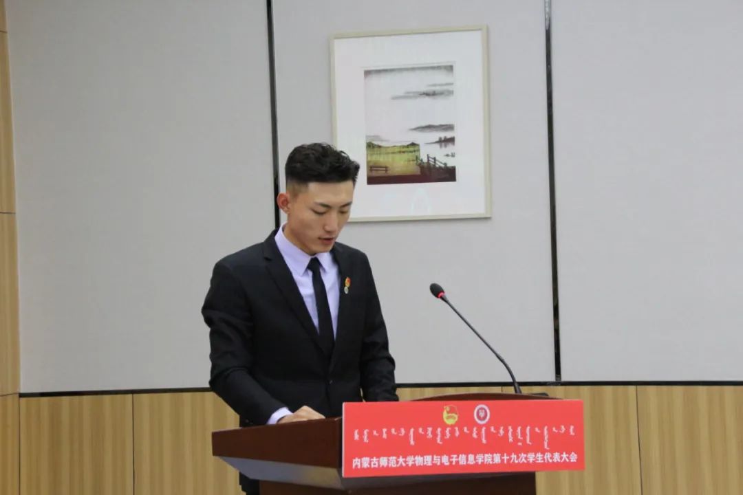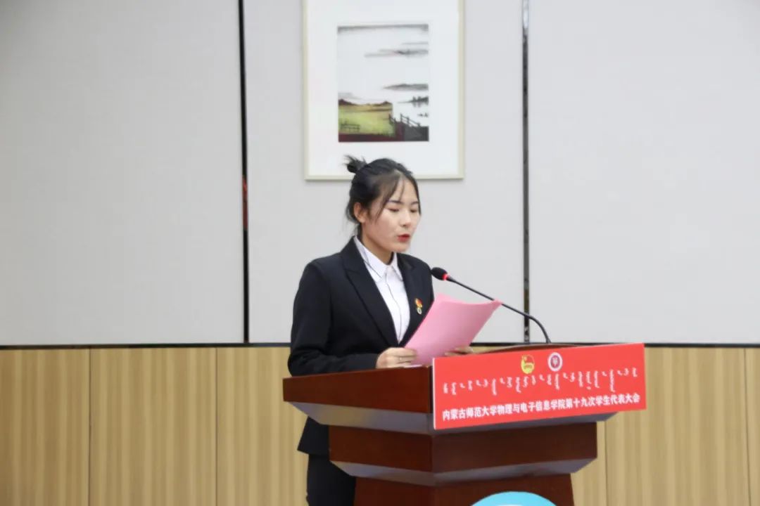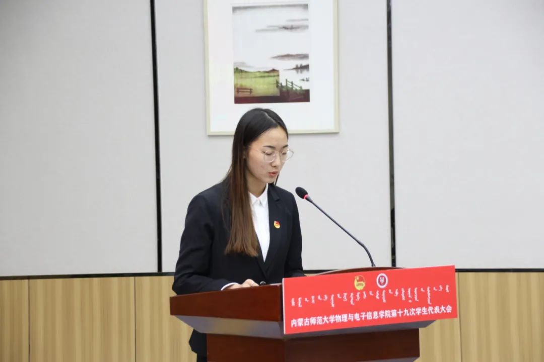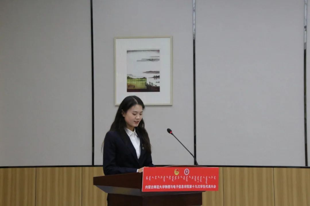 物理与电子信息学院学生会靖剑涛作了关于《内蒙古师范大学物理与电子信息学院第十八届学生会工作报告》,团总支同学学生兼职副书记曹若楠作了关于《内蒙古师范大学物理与电子信息学院第十九次学生代表大会代表资格审查报告》,学生会海兰作了关于《内蒙古师范大学物理与电子信息学院第十九次学生代表大会提案工作报告》。