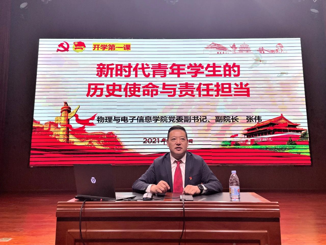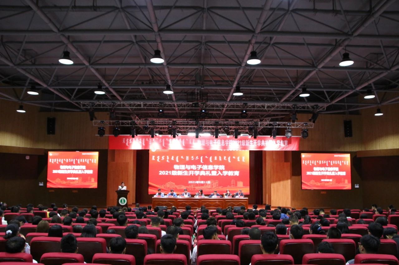 伴随着国歌的结束,大会正式开始。首先,由2018级物理蒙班车力格尔同学、2018级电子信息科学与技术班左晓芸同学、2019级物理学专业研究生李嘉欣同学作为老生代表进行了发言。学长学姐们欢迎了新生同学们加入物理与电子信息学院的大家庭,勉励同学们在大学里树立目标,不负韶华。随后,2021级物理汉1班李轹城同学作为新生代表发言,表示新生们必将努力尽早适应升入大学后的种种改变,以良好的精神面貌投入到学习生活中去。