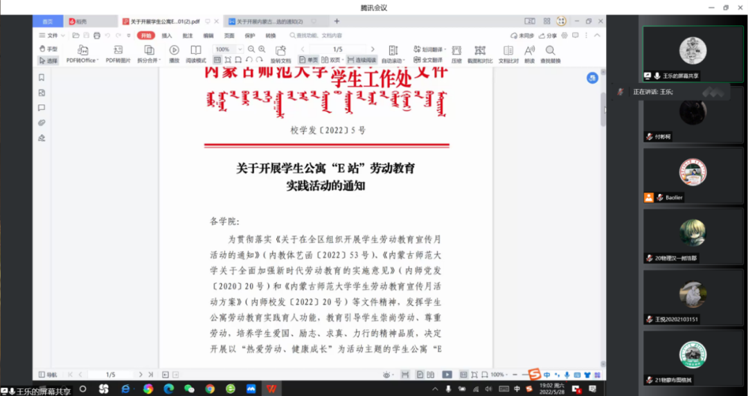 学习会上,王乐老师针对近期学工部开展的学生公寓“E站”劳动教育实践活动作了部署,宝力尔老师领学了习近平总书记关于劳动的重要论述。