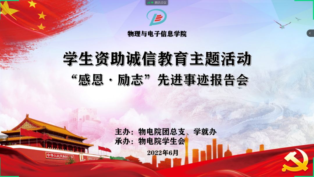 为贯彻落实全国高校思想政治工作会议精神,进一步做好资助育人工作,根据《教育部办公厅关于开展高校学生资助诚信教育主题活动的通知》(教资助厅函2013)1号)、《关于进一步做好诚信感恩励志等资助育人主题教育活动的通知》(内助学中心〔2019〕26号)文件精神,结合《内蒙古师范大学三全育人综合改革十大育人体系建设方案》资助育人体系建设方案要求,着力培养受奖助学生自强自立、诚实守信、知恩感恩、励志成才、勇于担当的良好品质,助力大学生的成长、成才、成功,积极推动我校资助育人工作,我院开展2022年学生资助诚信教育主题活动“感恩·励志”先进事迹报告会。