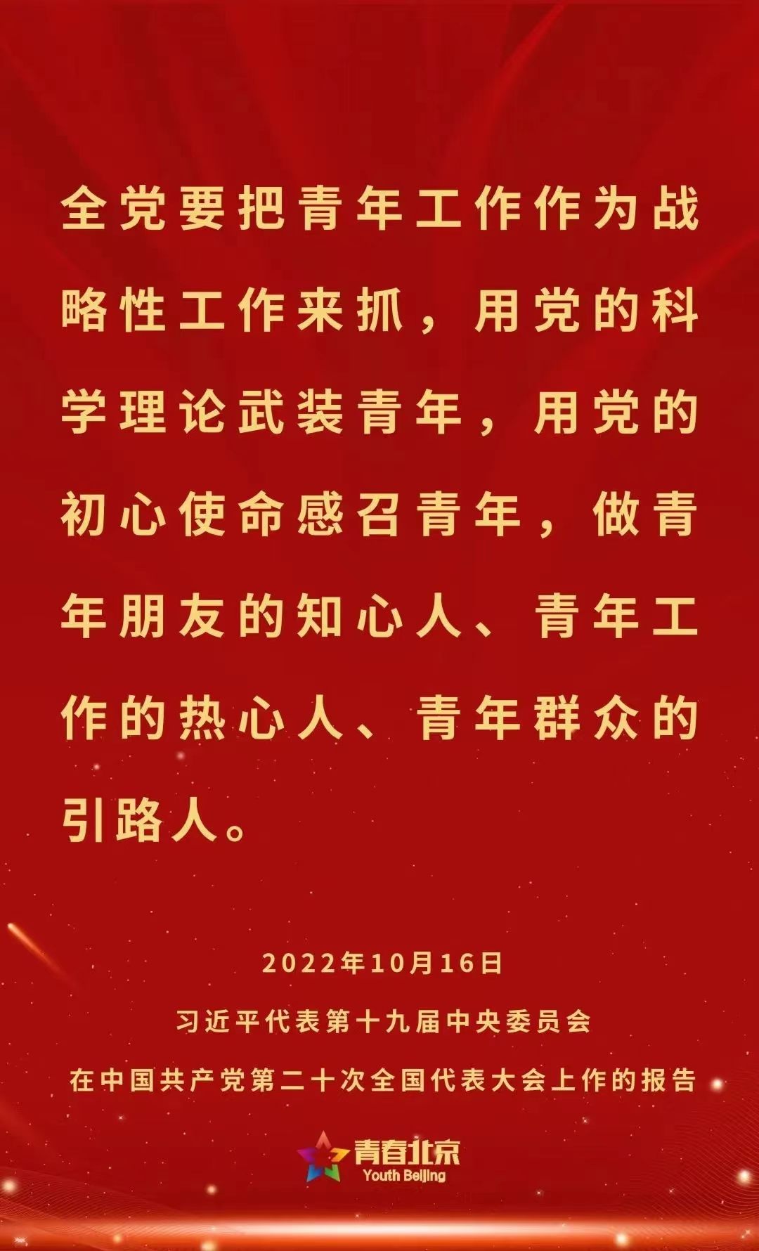 “青年强则国家强。当代中国青年生逢其时,施展才干的舞台无比广阔,实现梦想的前景无比光明。全党要把青年工作作为战略性工作来抓,用党的科学理论武装青年,用党的初心使命感召青年,做青年朋友的知心人、青年工作的热心人、青年群众的引路人。