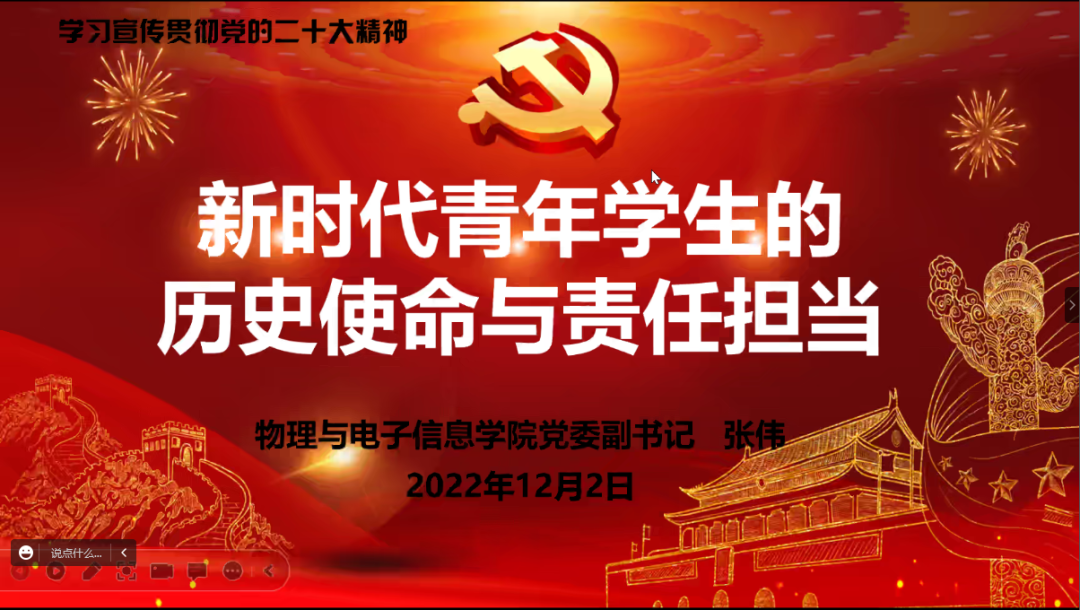 为全面学习宣传党的二十大精神,让青年在矢志奋斗中谱写新时代的青春赞歌,担起新时代青年的使命与责任,我院团总支于12月2日19:00组织第五期青马班学员聆听“新时代青年学生的历史使命与责任担当”专题讲座。