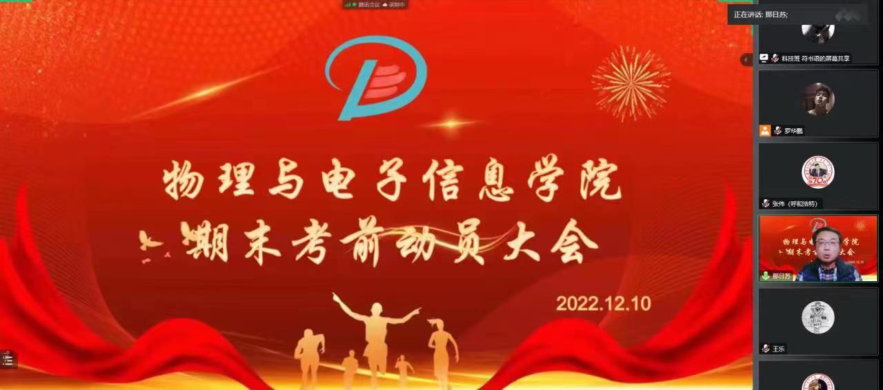 为树立我院学生诚信考试意识,端正学习心态,树立正确价值观,我院于2022年12月10日晚19:00,线上召开考前动员大会。党委书记刘美玲、院长曹永军、党委副书记、副院长张伟、副院长那日苏、团总支、学就办、2022级本科生、研究生班主任及全体学生参加。会议由学就办副主任王乐主持。