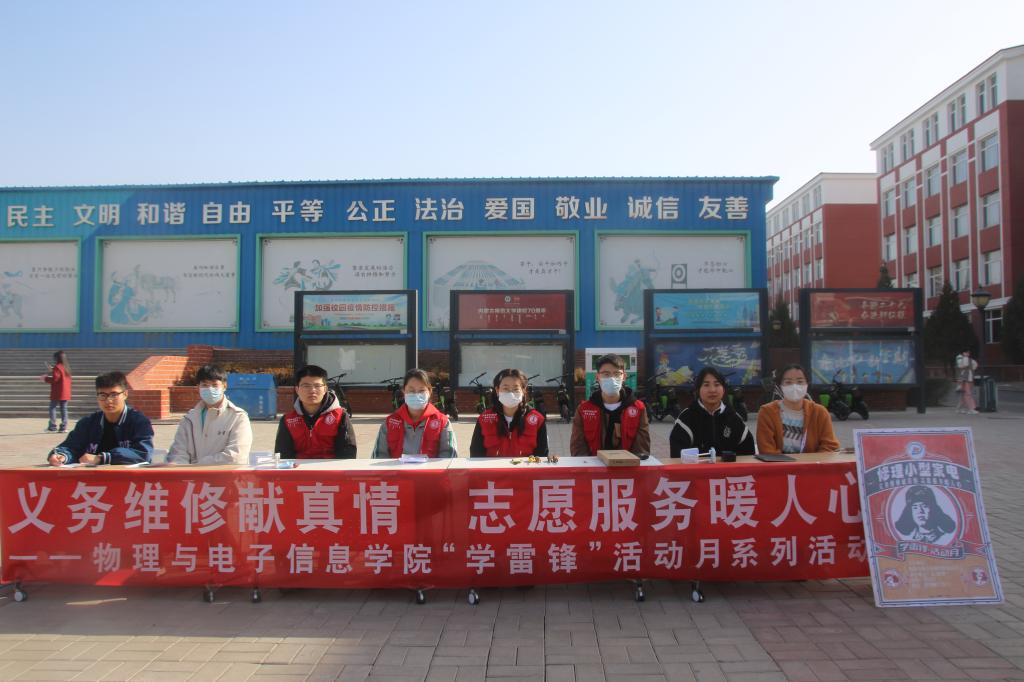 为进一步贯彻习近平总书记针对深入开展学雷锋活动作出的重要指示,将雷锋精神代代传承,推动我院志愿服务工作走深、走心、走实,3月5日,我院团总支在盛乐校区群鸿餐厅西门开展“义务维修献真情 志愿服务暖人心”志愿服务活动。