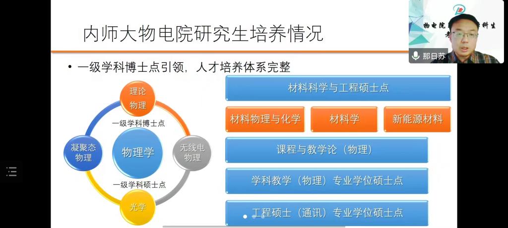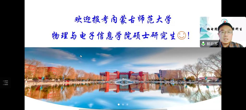 会上,那院长向同学们详细介绍了我院研究生办学水平和办学条件,鼓励同学们积极报考内蒙古师范大学物理与电子信息学院。