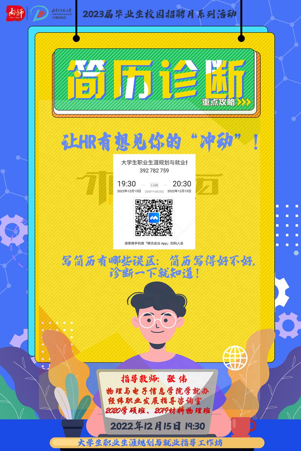 为全面提升毕业生求职能力,助力学生成功就业,我院大学生职业生涯规划与就业指导工作坊于2022年12月15日开展了简历诊断活动,经纬职业发展指导咨询室导师、学院党委副书记、副院长张伟老师为2020学硕班、2019材料物理班毕业班提供简历诊断服务。