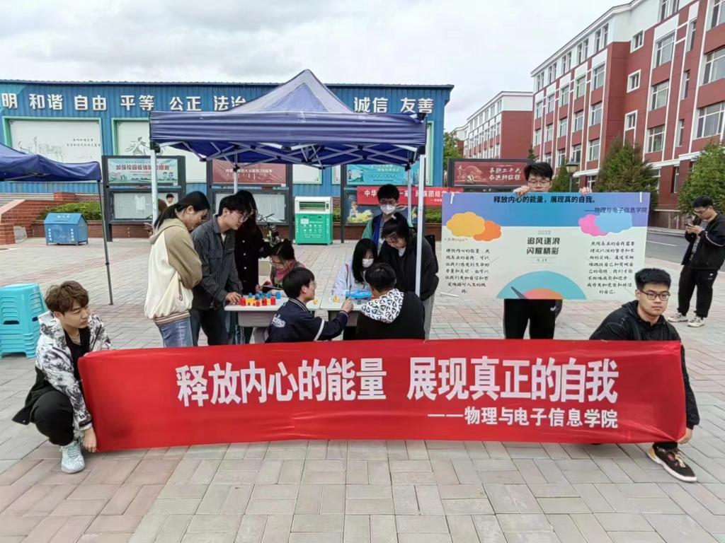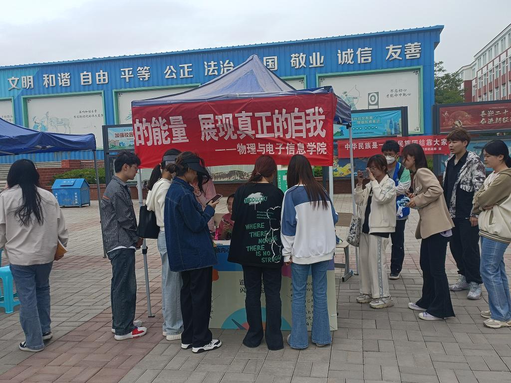 在2023年5月24日11:00——13:00,物理与电子信息学院心语馨苑工作站在内蒙古师范大学盛乐校区群鸿餐厅西门配合学校相关部门进行了“5.25”活动宣传。