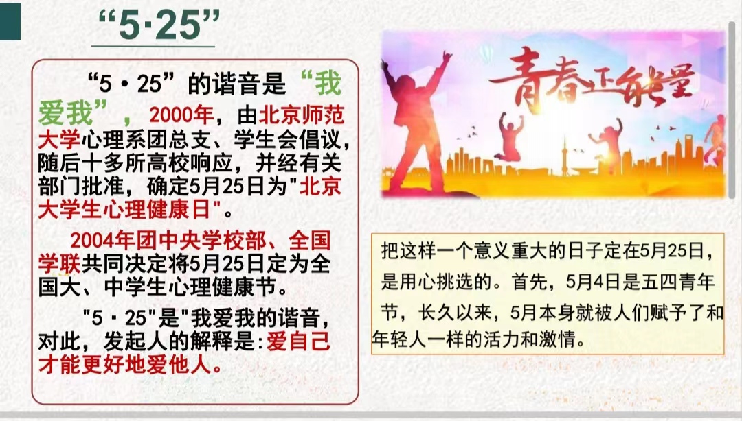 “5·25”的谐音是“我爱我”,2000年由北京师范大学心理系团总支、学生会倡议,随后十多所高校响应,并经有关部门批准,确定5月25日为“北京大学生心理健康日”。2004年团中央学校部、全国学联共同决定将5月25日定为全国大、中学生心理健康节。“5·25是“我爱我”的谐音,对此,发起人的解释是:爱自己才能更好地爱他人。