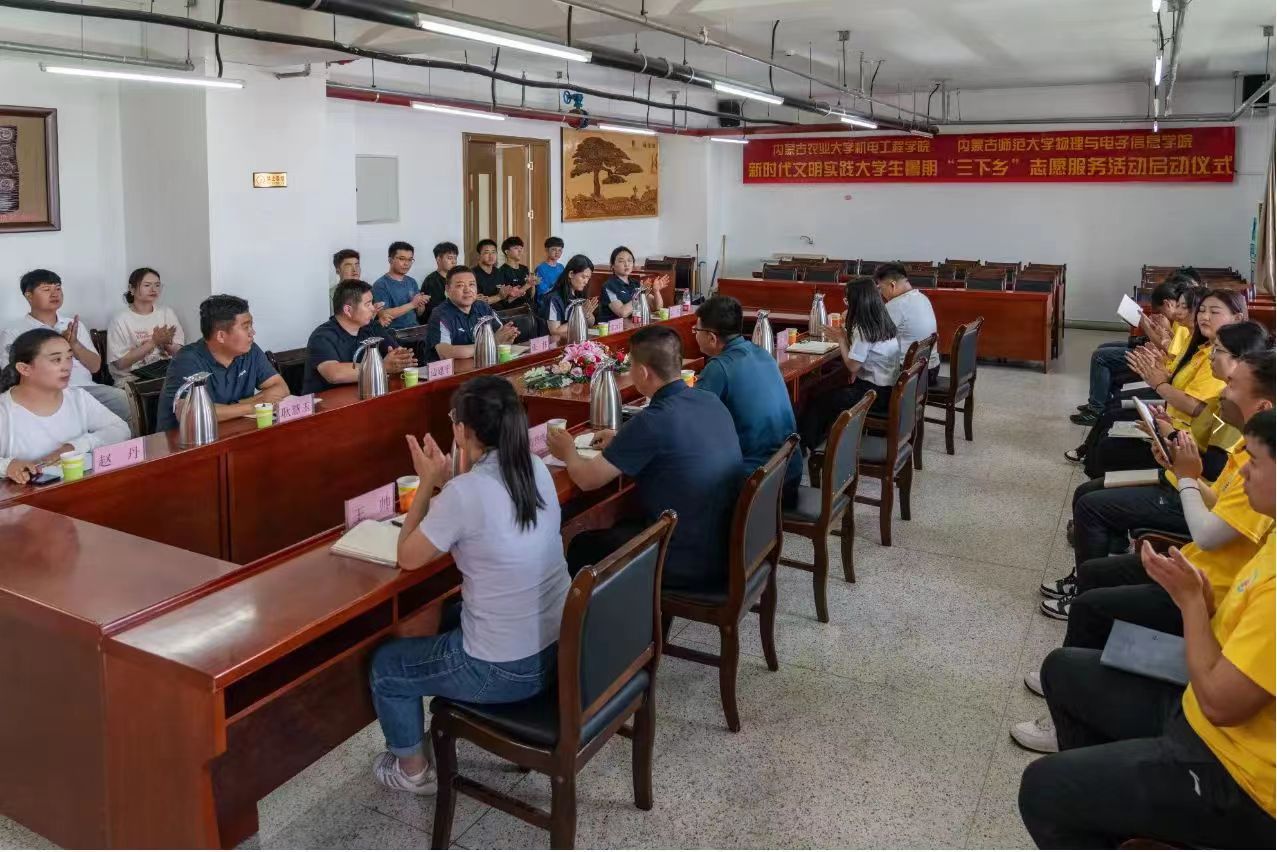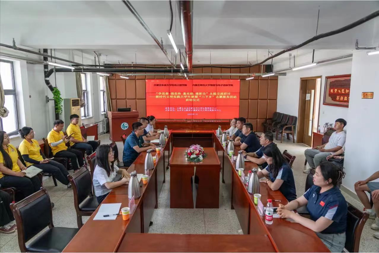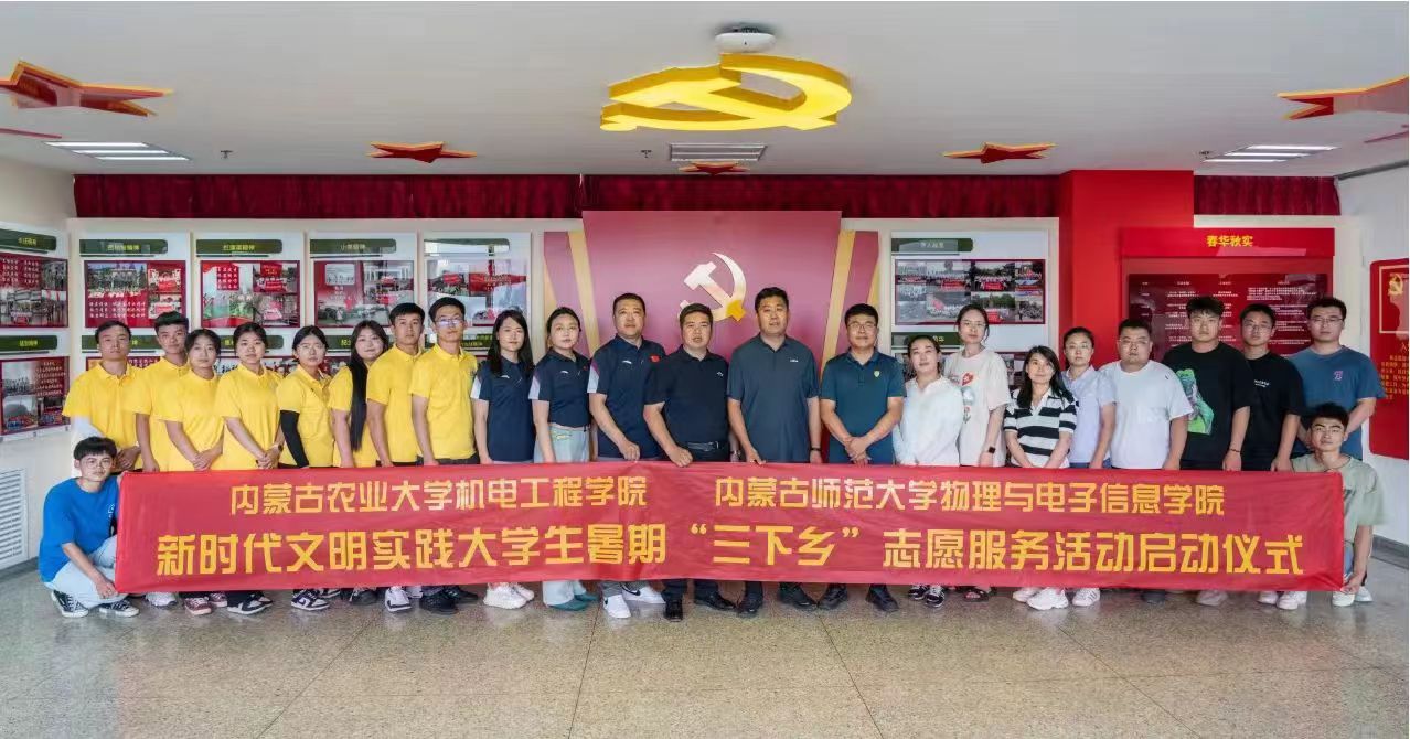 为深入学习宣传贯彻习近平新时代中国特色社会主义思想和党的二十大精神,引导和帮助广大青年学生上好“大思政课”,在社会课堂中受教育、长才干、作贡献,7月4日,由内蒙古自治区新时代文明实践研究中心指导、包头市土默特右旗新时代文明实践服务中心支持、内蒙古师范大学物理与电子信息学院与内蒙古农业大学机电工程学院联合开展的新时代文明实践大学生暑期“三下乡”志愿服务活动启动仪式在内蒙古农业大学机电工程学院会议室举行。