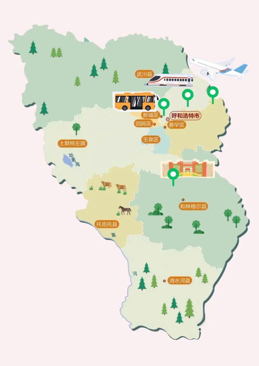 路线A:呼和浩特站地铁二号线D口上车(阿尔山方向)→诺和木勒站下车B口出→换乘公交53路/83路凯德MALL站(什兰岱方向)→师大北门站下车(预计42分钟)
