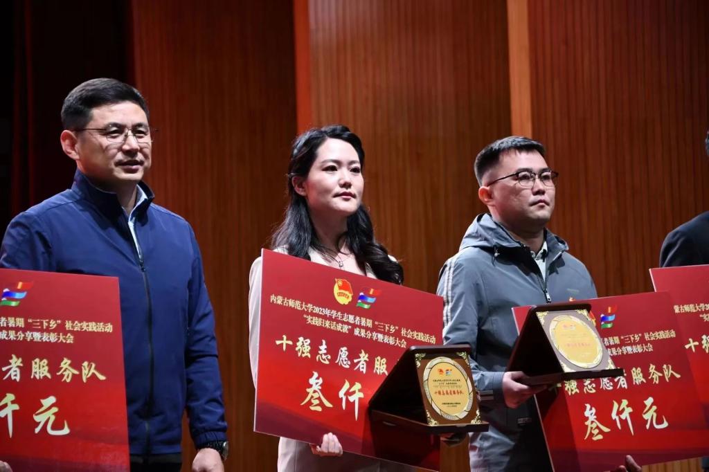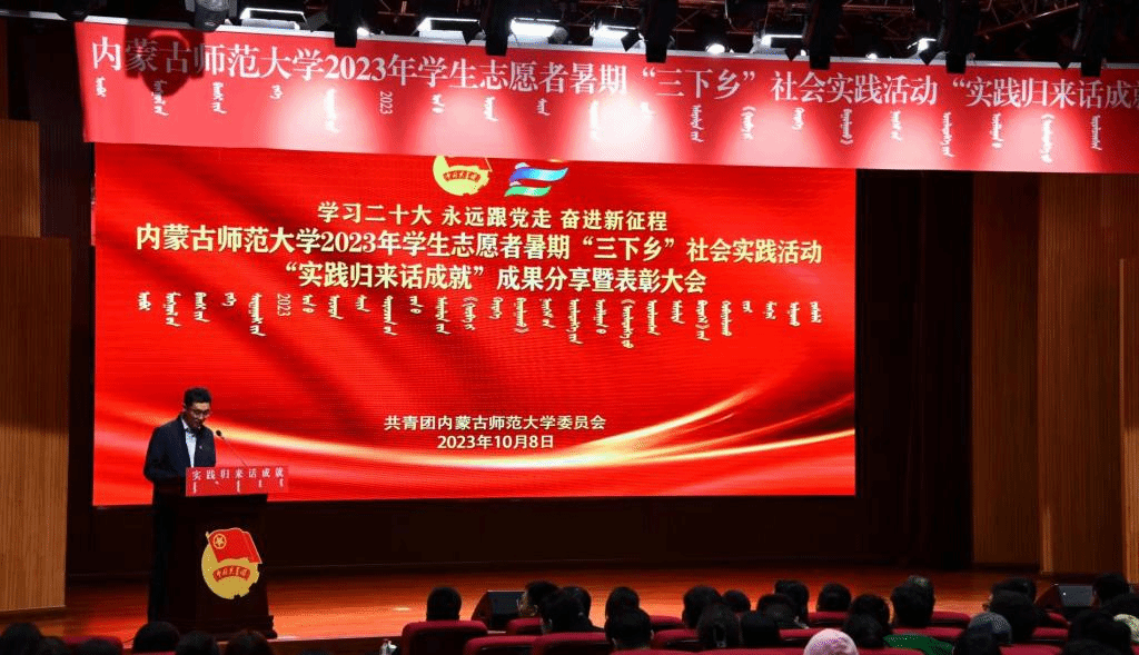 2023年10月8日下午,内蒙古师范大学2023年学生志愿者暑期“三下乡”社会实践活动“实践归来话成就”成果分享暨表彰大会在盛乐校区图书馆二楼报告厅举行。内蒙古师范大学党委委员、副校长韩巍,相关部门负责人,各学院党委(党总支)书记、副书记、团总支负责人,学生志愿者代表500余人参加了本次分享会,团委孟伟东老师主持分享会。在本次表彰会上,我院斩获三项大奖。
