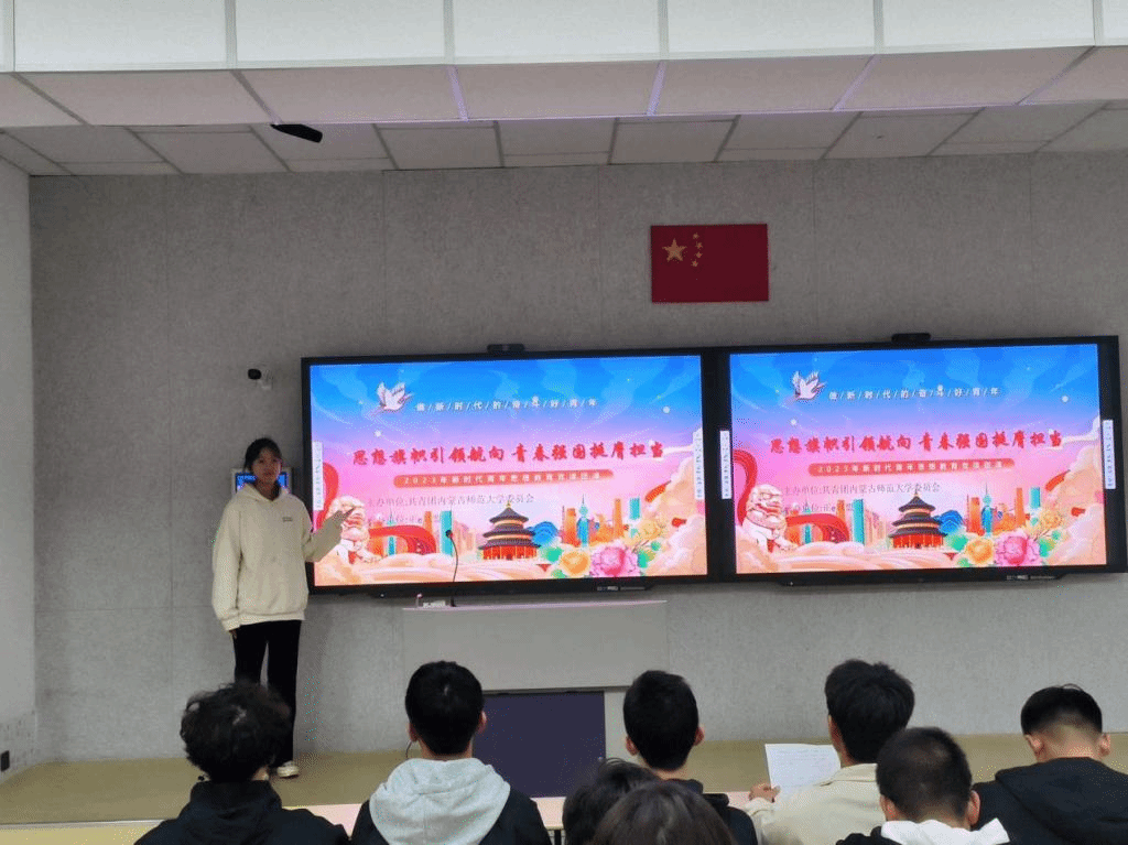 为认真学习宣传贯彻习近平总书记重要讲话精神,落实党中央精神,促进学生成才,着力加强对青年思想政治引领并增强学生社会责任感和使命感,10月20日晚,物理与电子信息学院正e联盟社团在行知楼209开展了"思想旗帜引领航向,青春强国挺膺担当"主题团日活动。