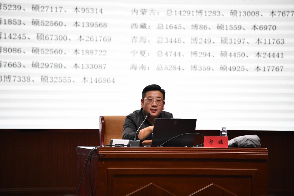 讲座伊始,祁麟老师从毕业生数量,学历层次等角度入手,向同学们讲述了就业三大主要方向,考研政策与考研全流程安排、同时介绍了考研考试内容,各科卷面结构,提醒学生提前做好考研规划。最后祁麟老师重点介绍了可考专业选择的技巧和注意事项。强调选择院校,关键要结合自身学习情况、院校情况等进行综合考虑。