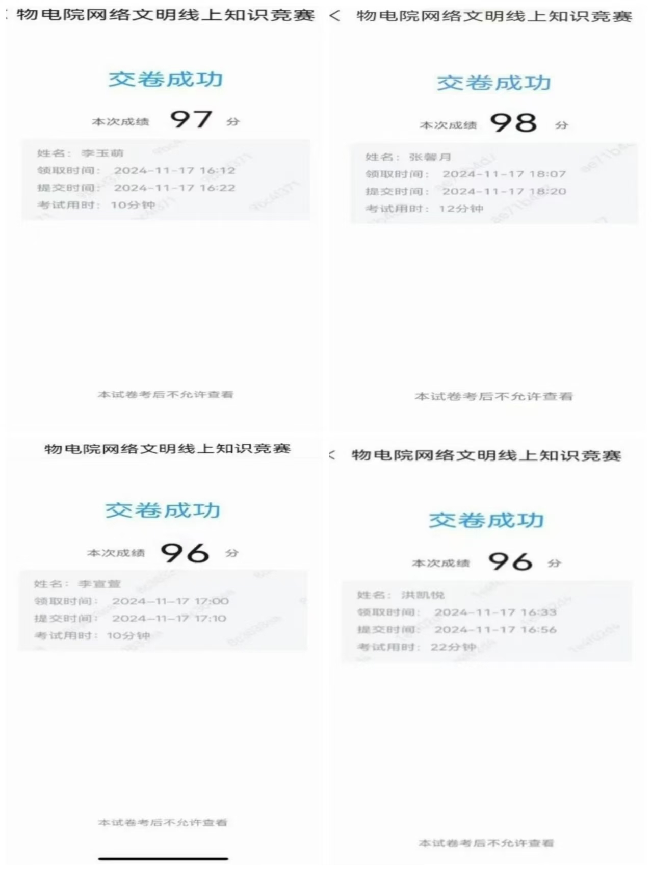 本次活动吸引了我院近300名同学参与,同学们利用自己所了解的网络知识认真作答竞赛题目,以赛促学,拓展了网络文明知识面,激发了网络责任感,引导同学们正确使用互联网资源,推动大家积极参与文明网络空间的维护,防范网络诈骗和不良信息的侵害,共造互联网清朗环境,为新时代高质量网络环境创设贡献自己的力量。