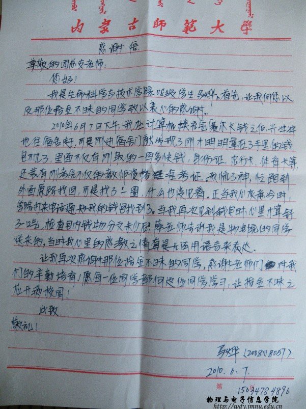 6月7日下午,我院2009级工程三班学生柳梦蛟同学捡到一钱包,及时找到失主并将钱包归还给生科院学生。该生这种拾金不昧的精神值得我们学习,学院决定给予柳梦蛟同学全院通报表扬。