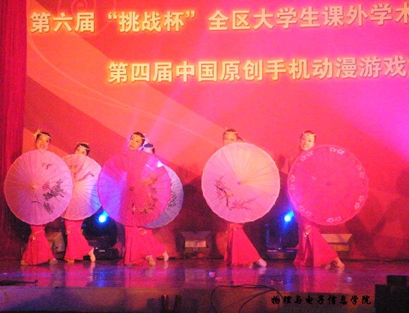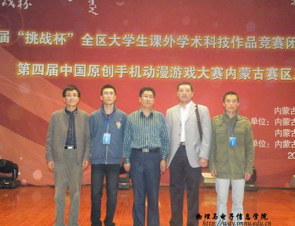 2009年10月23日于我校盛乐校区举行的全区第六届“挑战杯”大学生课外学术科技作品竞赛中,我院2007级工程2班杨桂全同学作品获得全区一等奖、2007级工程2班林育新、2006级汉班覃伟政、蓝荣、张利霞等同学也分别获奖。颁奖晚会上我院党总支副书记、副院长辛智俊老师亲临现场。我院“百灵杯”获奖节目为颁奖嘉宾、领导老师及全体同学献出了精彩表演。晚会结束后辛老师与参赛选手合影留念。