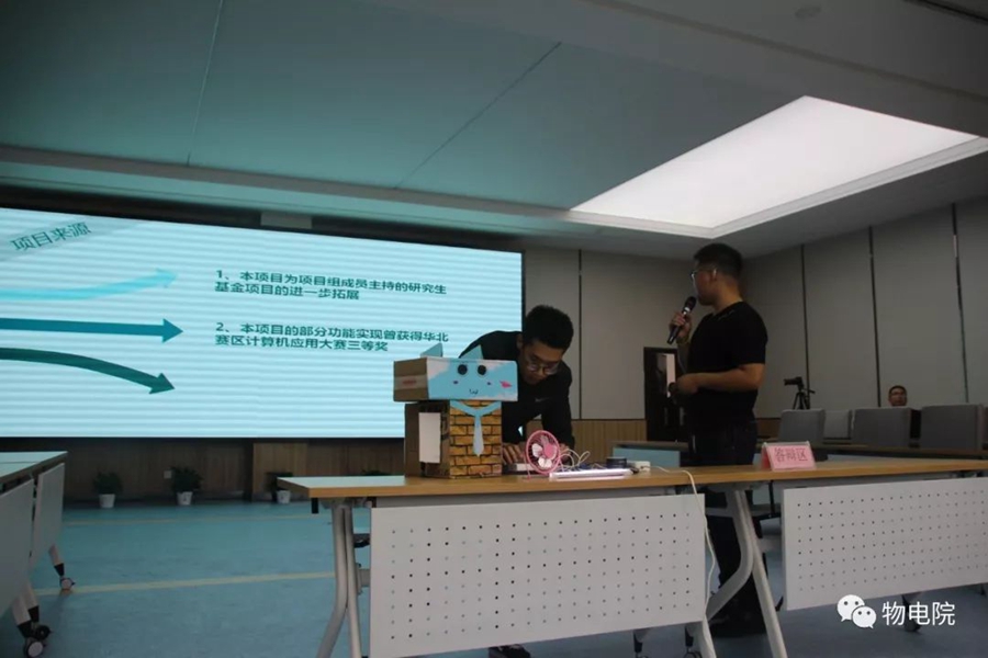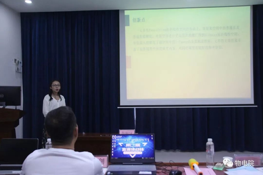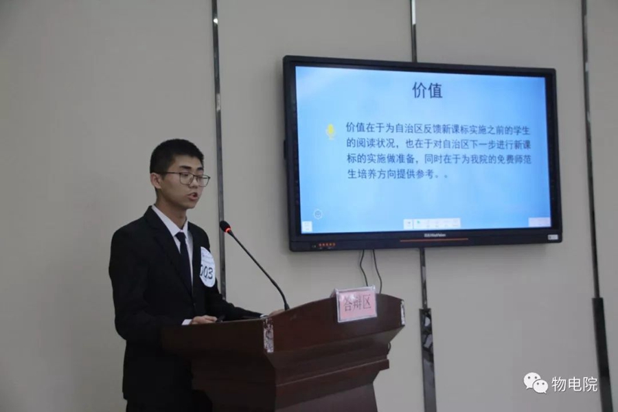 5月30日下午三时,决赛答辩会正式开始。自然科学类论文,科技发明制作类作品以及哲学社会科学类社会调查报告和学术论文三类比赛同时进行。科学技术史研究院副教授董杰、物理与电子信息学院教授田晓、生命科学与技术学院教授弓剑、数学科学学院副教授萨贺雅、化学与环境科学学院副教授阿古拉、计算机科学技术学院副教授孟繁军、科技处成果管理科科长苏玉明、科技处理工项目管理科科长邬友、教务处教学科科长侯欣舒担任本次竞争赛评委。 在自然科技类学术论文、哲学社会科学学术论文与哲学社会科学类社会调查报告分赛场中,选手们以缜密的逻辑和简洁的的语言在短暂的五分钟内将论文报告、调查结果进行了充分展示,他们精彩的阐述与科学严谨的思路赢得了阵阵掌声和评委老师的一致好评。根据选手们的选题角度、创新程度、思维深度、研究过程以及已获得的学术成果等方面,选手们与评委们进行了精彩的答辩,使听众们收获了一场丰盛的知识盛宴。