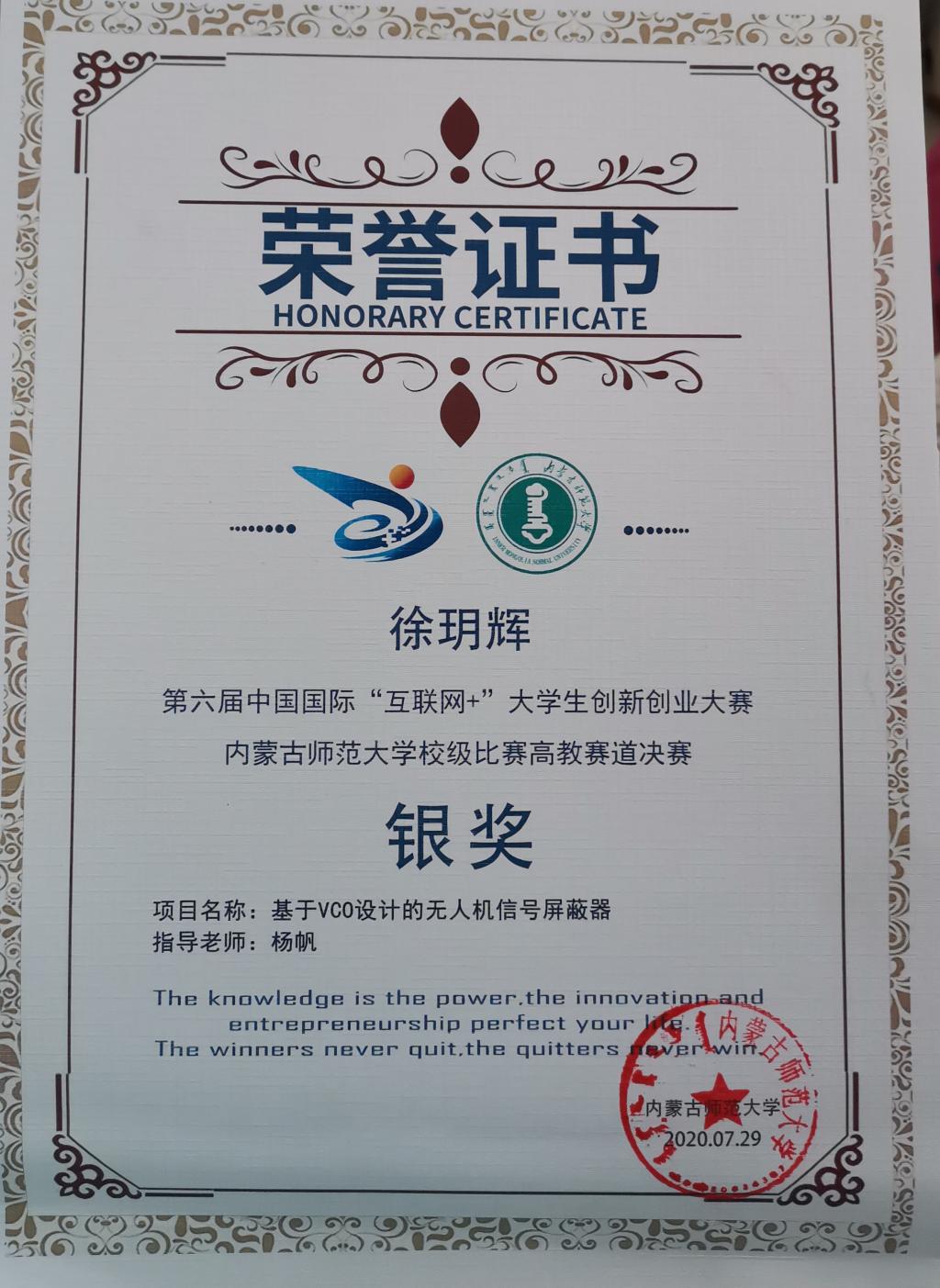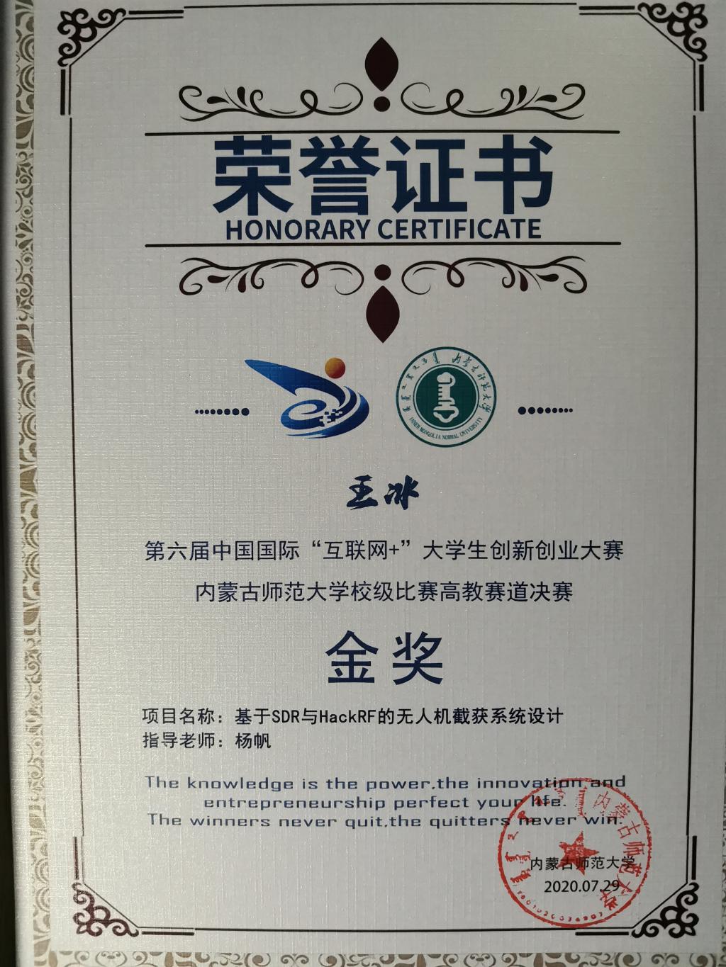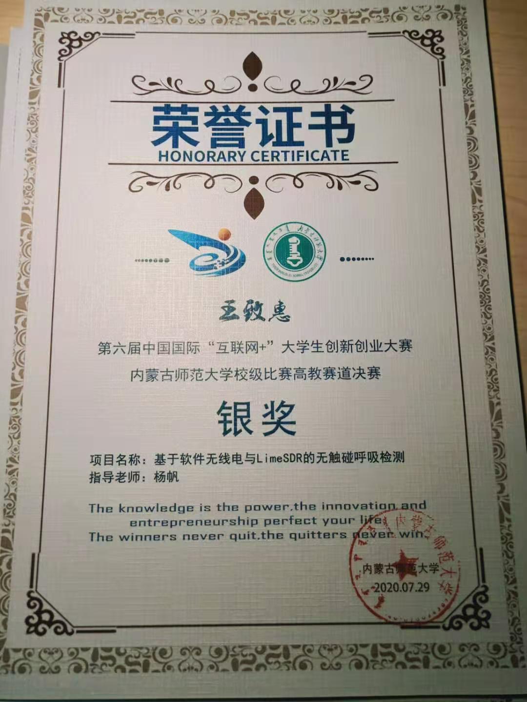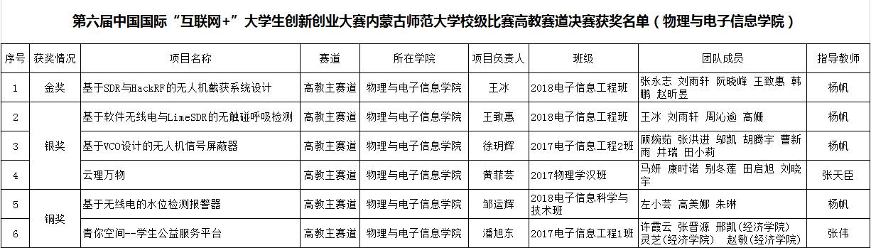 7月30日,第六届中国国际“互联网+”大学生创新创业大赛内蒙古师范大学校级比赛落下帷幕,物理与电子信息学院2018电子信息工程班王冰《基于SDR与HackRF的无人机截获系统设计》,2018电子信息工程班王致惠《基于软件无线电与LimeSDR的无触碰呼吸检测》,2017电子信息工程2班徐玥辉《基于VCO设计的无人机信号pingbi器》,2017物理学汉班黄菲芸《云理万物》,2018电子信息科学与技术班邹运辉《基于无线电的水位检测报警器》,2017电子信息工程1班潘旭东《青你空间--学生公益服务平台》等6个项目在高教主赛道决赛中分获金、银、铜奖。