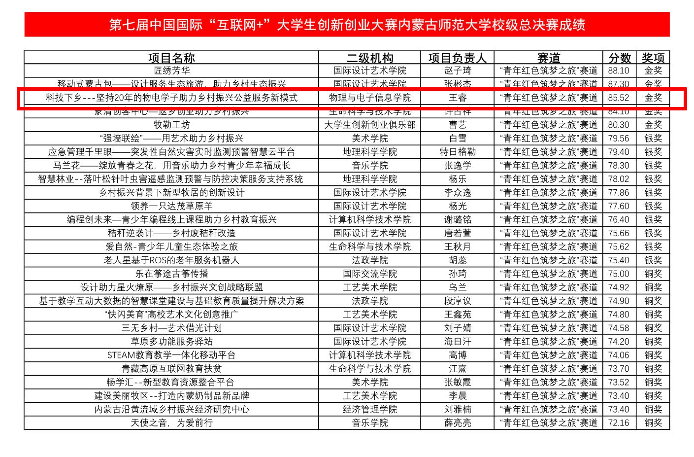 7月12日,由招生就业处主办、计算机科学技术学院承办的第七届中国国际“互联网+”大学生创新创业大赛内蒙古师范大学校级总决赛在赛罕校区信息楼开赛。由我院党委副书记兼副院长张伟、辅导员宝力尔、宋鑫伟指导的《科技下乡一坚持20年的物电学子助力乡村振兴》项目荣获“青年红色筑梦之旅”赛道金奖,项目负责人为2019级材料物理班王睿。