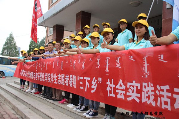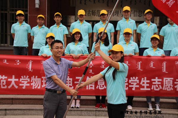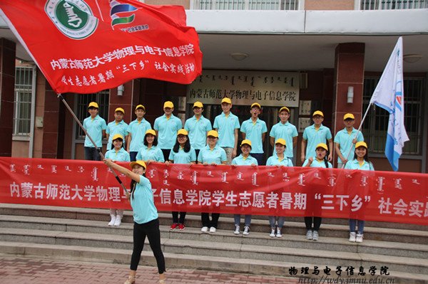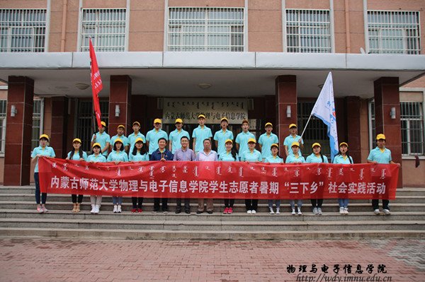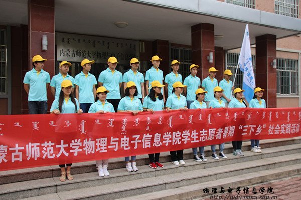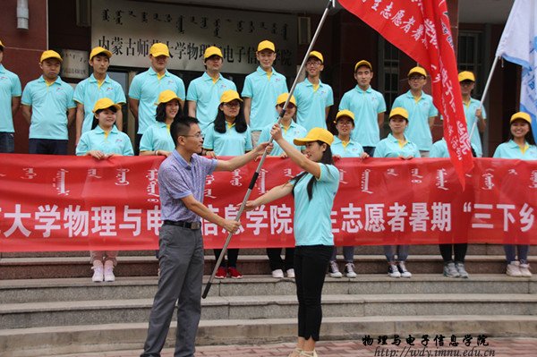 2016年7月18日上午,我院2016年大学生志愿者暑期“三下乡”社会实践活动启动仪式在物理楼前举行。学院党总支副书记何小龙老师、克伦老师、李海泉老师等领导老师出席仪式并由何老师为“科技扶贫”志愿服务队授旗。青年志愿者们将从校园走向农村,利用他们所学的知识及技能带到应用实践的“第二课堂”中,帮助农村群众解决生活中的难题。 我院2016年“三下乡”社会实践活动从7月18日开始,紧紧围绕校团委下达的“建功十三五•青春亮北疆”的活动主题,牢牢抓住“走进农村 点亮青春 科技宣传 扶贫助困”这一活动宗旨,用科技加行动,为成就个人精彩人生打下坚实基础,为打造祖国北疆亮丽风景线做出更大的贡献。18日上午,科技三下乡服务队启程赴乌兰察布市察右后旗锡勒乡红旗庙嘎查(内蒙古师范大学扶贫点)开展活动。为当地村民普及用电常识,宣讲家电维护和保养知识,并为村民义务做家电维修、科技宣传等专项服务。