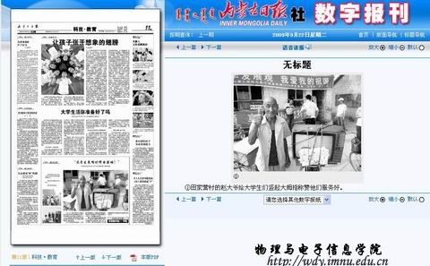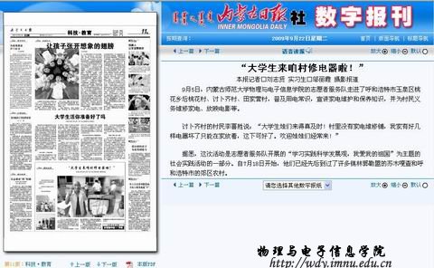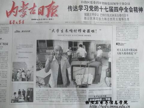 (内蒙古日报记者 刘志贤 实习生 邬丽霞 摄影报道 2009年9月22日星期二)9月5日,内蒙古师范大学物理与电子信息学院的志愿者服务队走进了呼和浩特市玉泉区桃花乡后桃花村、讨卜齐村、田家营村,普及用电常识,宣讲家电维护和保养知识,并为村民义务维修家电、放映电影等。