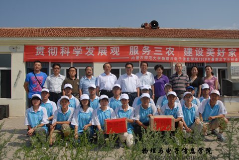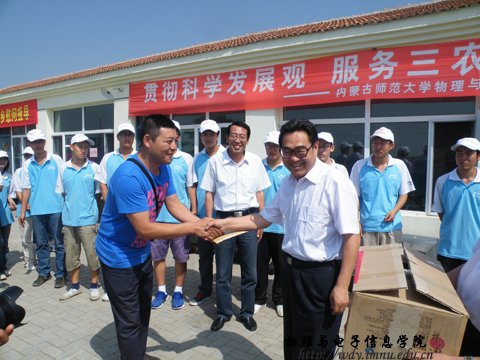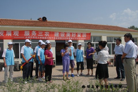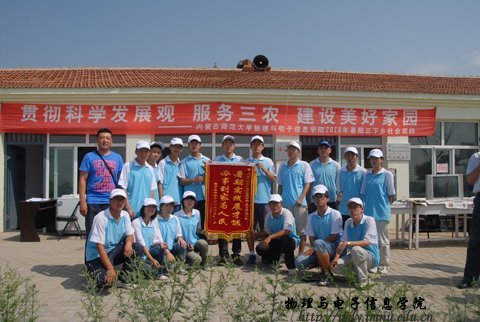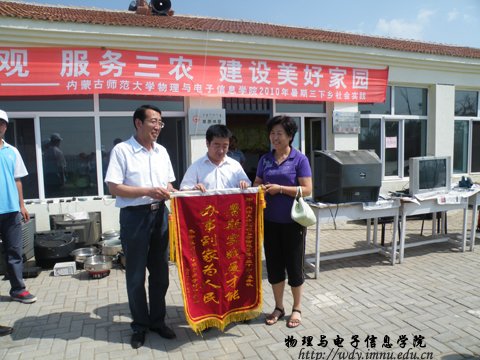 我院以“贯彻科学发展观,服务三农,建设美好家园”为主题的“三下乡”社会实践从7月11日开始,先后到集宁区白海子镇、马莲渠乡开展活动。为当地村民普及用电常识,宣讲家电维护和保养知识,并为村民义务维修家电、放电影等。 7月14号上午,志愿者们看望了白海子镇老党员乔吉贵和低保户杜枝梅两家,并带去牛奶和西瓜等物品。活动期间,服务队共收到损坏的电视机、电冰箱、洗衣机、电饭煲、鼓风机等家电共300余件,修好230多件。白海子镇村民孙大爷竖起大拇指夸赞志愿者队员们说:“娃娃们真厉害。”20日上午,白海子镇党委书记代表全体村民为服务队送来写着“暑期实践展才能、办事到家为人民”锦旗,马莲渠乡三成局村民高大爷也送来感谢信感谢志愿者们的周到服务。