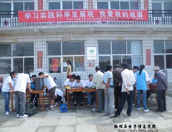 物理与电子信息学院2009年暑期大学生“三下乡”社会实践活动从7月18日开始到8月20日结束开展为期一个多月的送科技下乡活动。本次实践活动将在呼市周边农村、锡林郭勒盟西乌旗周边苏木进行。活动情况将在学院网站做详细报道。