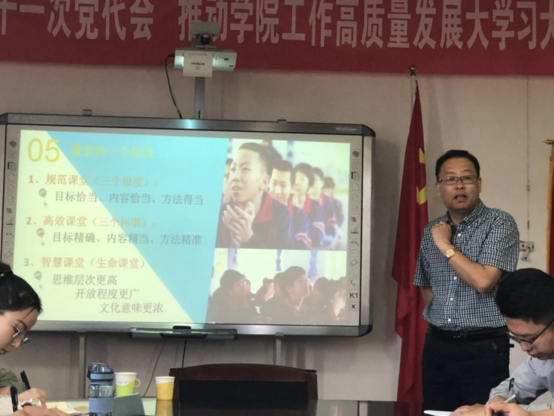 首先,张老师给予了同学们入职前的一些忠告:新入职的教师一定要放低姿态、不断学习,努力熬过工作适应期,在不断的历练中成为一名优秀教师。随后,张老师谈到教育教学上的问题,他强调我们的课堂分为规范课堂、高效课堂、智慧课堂三个层次。教师在关注学生成绩的同时也要关注学生的心理健康和精神成长,培养学生的综合素养。引导鼓励学生制定、分享学业目标,追踪、考核、反馈学业目标。除此之外,他还从课程解读、启秀文化、启秀荣誉三个方面对启秀中学做了简单的介绍,邀请各位研究生同学到启秀中学就职。在讲座的末尾,张老师从校长的角度出发,对各位同学提出的问题进行了详尽的解答。