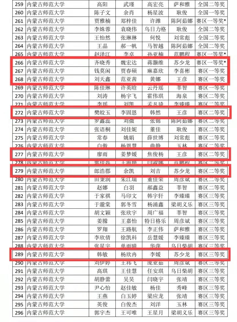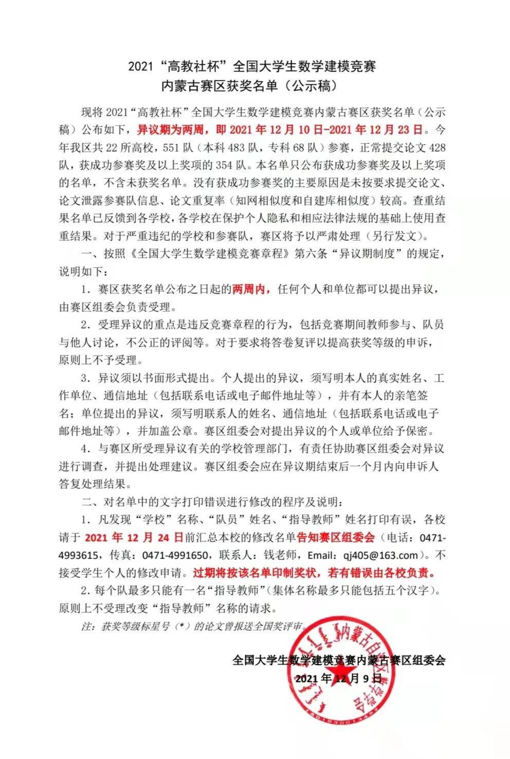 近日,全国大学生数学建模竞赛组委会宣布的2021年全国大学生数学建模竞赛获奖名单中,由我院教师王彦、李喜斌、苏少龙指导,我院2018级、2019级和2020级18名学生组成的6个参赛队荣膺2021年全国大学生数学建模竞赛本科组内蒙古赛区一等奖三项,二等奖三项,三等奖一项。所有6支参赛小队全部获奖,获奖数量创我院史上最佳。