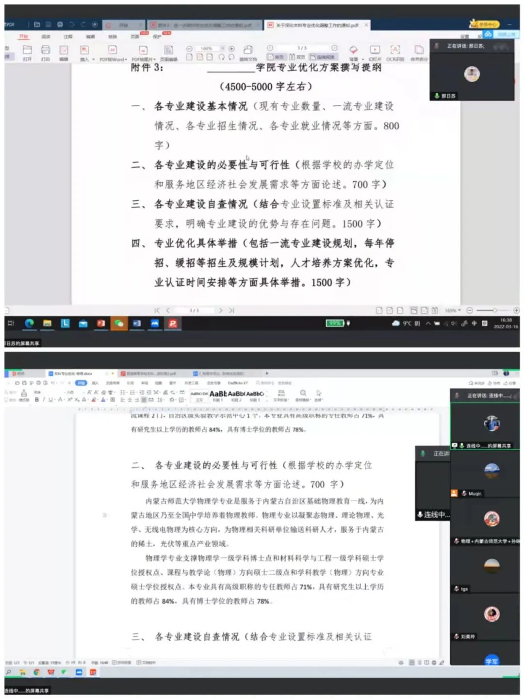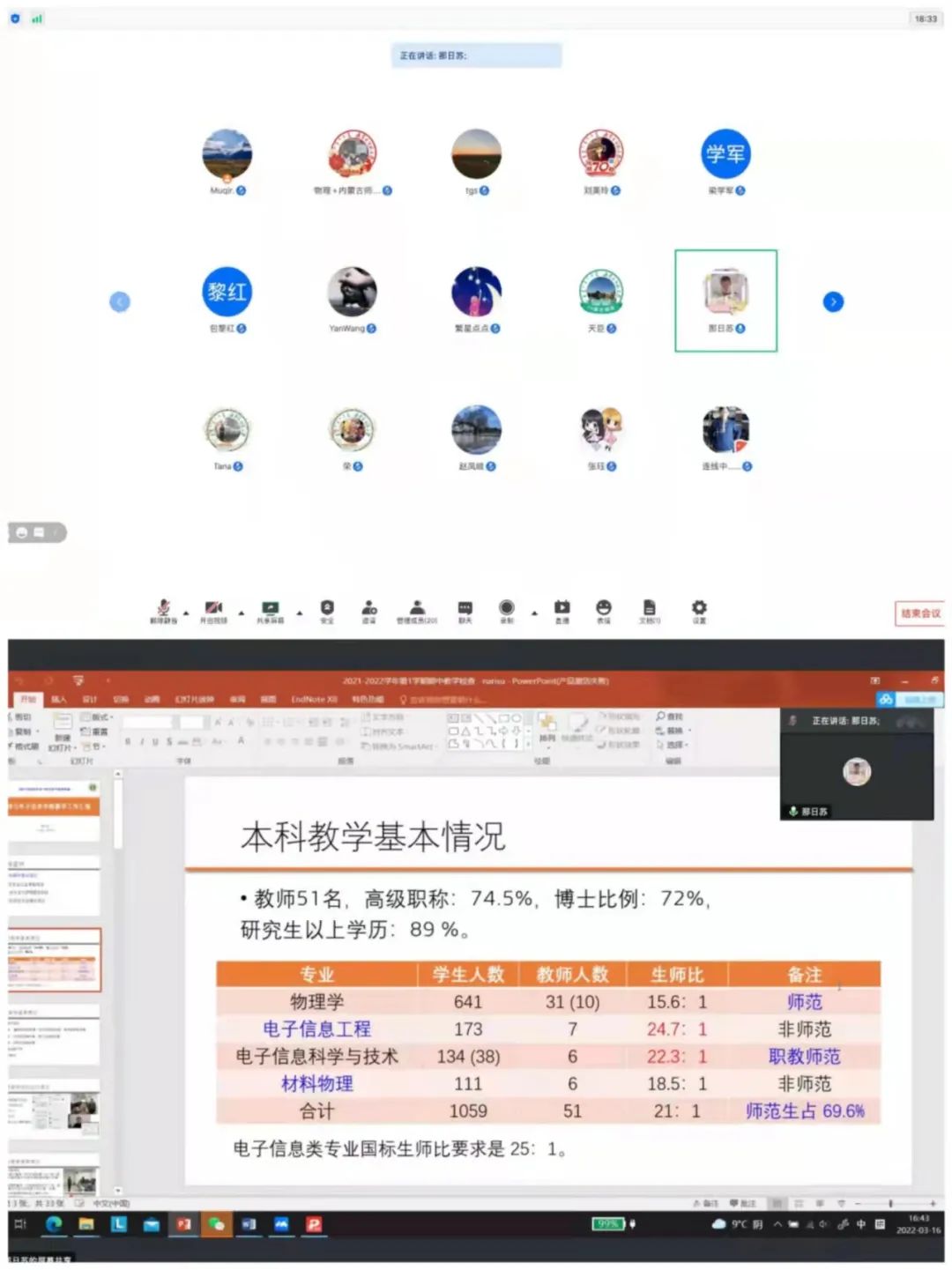 为加强专业建设,进一步优化专业布局和结构,提高人才培养质量,3月16日下午,我院召开本科专业优化方案线上研讨会。学院教学委员会全体成员,物理系、材料系和电子系系主任参加了研讨会。会议由副院长那日苏主持。