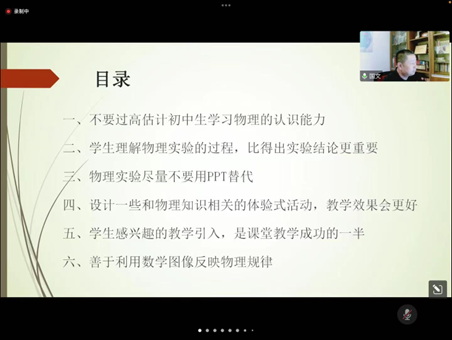 5月7日晚20点,我院教师教育系列专题讲座第三场在线上举行。本次讲座特邀呼和浩特市实验中学高级物理教师、内蒙古师范大学物理与电子信息学院硕士研究生导师、“国文物理工作室”主持人郭文老师。郭老师以《初中物理教学设计的几点建议》为题做了精彩报告。我院所有教育硕士研究生、部分本科师范生和教师教育团队教师一同参与交流和学习。