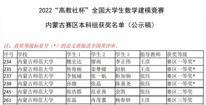 近日,全国大学生数学建模竞赛内蒙古赛区组委会公布了2022“高教社杯”全国大学生数学建模竞赛内蒙古赛区获奖名单。“2022高教社杯全国大学生数学建模竞赛”共有来自全国及海外其他国家的1606所院校(校区)、54257支团队、超过16万人报名参赛。今年内蒙古自治区共 21 所高校,536 队(本科组 417 队,专科组 119 队)参赛。其中本科组获赛区三等奖以上的队伍230队。