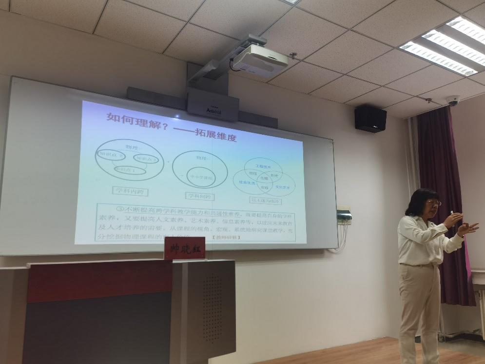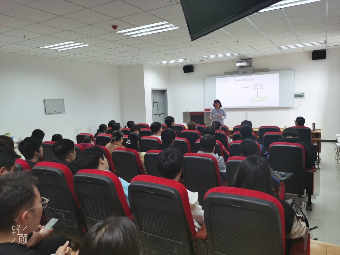 本次报告会,帅教授以风趣幽默的语言、典型可靠的案例、饱含激情的展示、机智真诚的回答为师生真诚地讲解如何在核心素养导向下做“跨学科实践”。交流中,帅老师谈到,对一个研究型的教育硕士的学习而言,每一位学生应该做到:第一,立足立德树人和物理学科核心素养课程目标,对新版高中物理课程标准进行深度研读和挖掘,从课标中寻找进一步研究的突破口和新意;第二,要重视学科内、学科间知识的深度融合,以主题为核,运用基于大概念的整合性教学“整体--部分--整体”的新思路去做跨学科实践和教学设计;第三,要在物理实验方面下功夫多思考,凡是可以用材料演示的实验都可以做创新性的优化和改善。