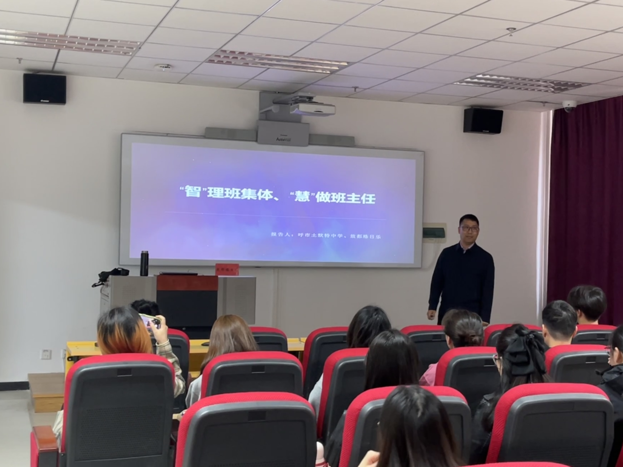 敖都格日乐老师从“什么是班集体、班主任、班级管理”到“自己当班主任的理论依据”再到“如何当好一名班主任”三个方面层层递进,为同学们详细的介绍了班主任工作